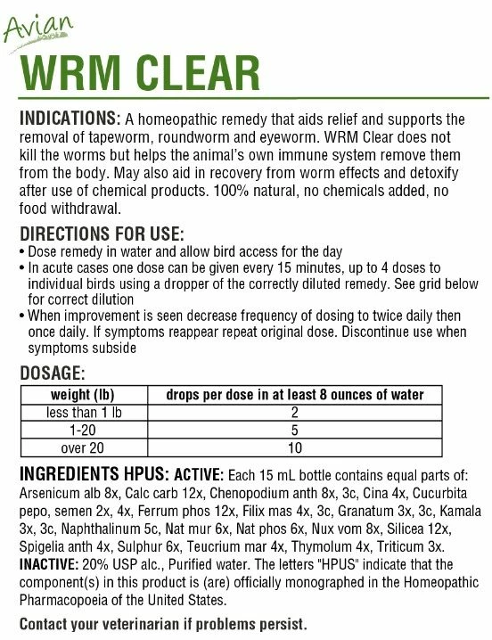 Avian Wrm Clear is an all natural remedy for birds that aids relief and support the removal of tapeworm, roundworm and eyeworm. Wrm clear does not kill the worms but help’s the animals own immune system remove them from the body. The product has no chemicals and is 100% natural.