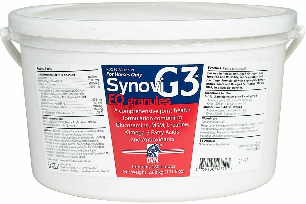 A comprehensive equine nutritional supplement combining glucosamine, MSM, creatine, Omega-3 fatty acids, antioxidants, vitamins and minerals. These ingredients help repair and rebuild cartilage and joint damage plus relieve and reduce pain and swelling from injury and overexertion. Contains glucosamine HCI 1800 mg, MSM 1600 mg, creatine monohydrate 1000 mg, perna canaliculus 600 mg, vitamin C 20 mg, vitamin E 100 I.U. per serving.