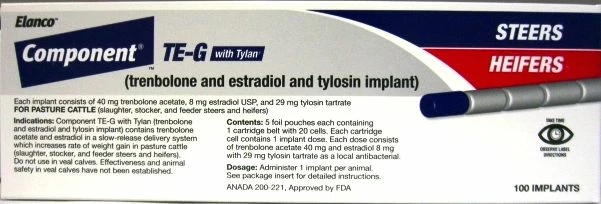 Component TE-G with Tylan is a cattle implant containing 40mg of trenbolone acetate, 8mg of estradiol USP and 29mg of tylosin tartrate.