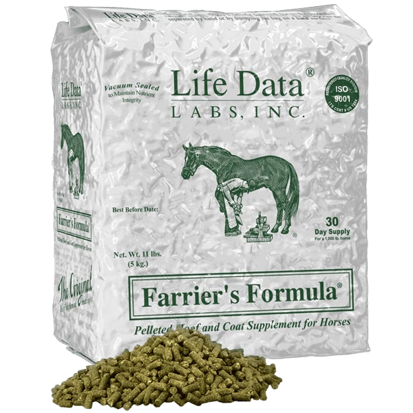 Farrier’s Formula is a pelleted hoof supplement for horses. It can be added as a top dressing on the regular feed or given separately. Each serving provides essential nutrients such as phospholipids, omega fatty acids, vitamins and minerals as well as important amino acids. The combination of these nutrients enable horses to build strong connective tissue proteins important for healthy hoof structure and growth.