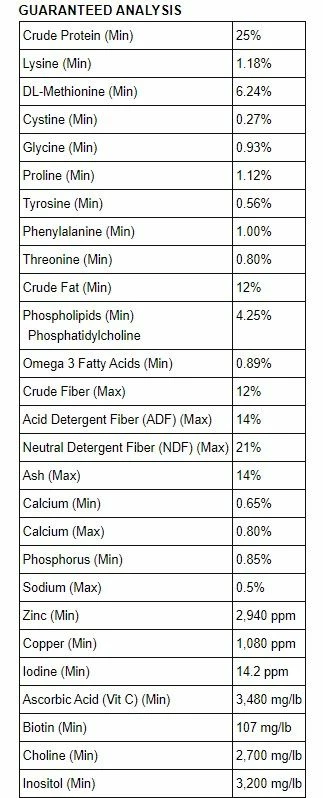 Dehydrated Alfalfa Meal, Soy Protein Concentrate, Lecithin, Yeast Culture Dehydrated, DL-Methionine, Hydrated Sodium Calcium Aluminosilicate, Biotin, Ascorbic Acid, Zinc Oxide, Basic Copper Chloride, Fenugreek Extract, Calcium Iodate.
