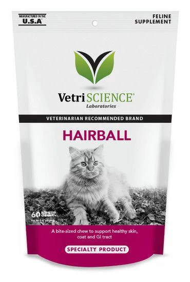 Hairball from VetriScience is a supplement for cats designed to support skin tone, elasticity and hair health. Hairball helps promote healthy skin and GI tract as well as help with urinary tract health issues. Cats love these delicious The delicious chicken liver flavored chews will reeadily be taken by your cat.