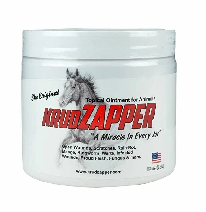 Krud Zapper Horse Ointment is a medicated topical ointment to be used on animals with skin conditions. Can be used to treat Ringworm, Rain Rot, cracked heels, fungus, proud flesh, infected wounds, warts, Florida sores and more.