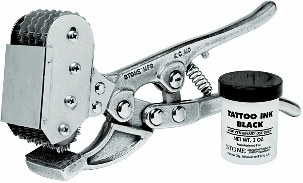 The Pro Rotary Tattoo Plier features double action which makes a deep bite with a short, easy pull. This prevents forearm fatigue even when marking hundreds of animals. The PRO ROTARY has five continuous chains, each with 10 numbered digits (0-9) and two blank spaces. Similar to a dating stamp, digits are easilly selected by rotating.