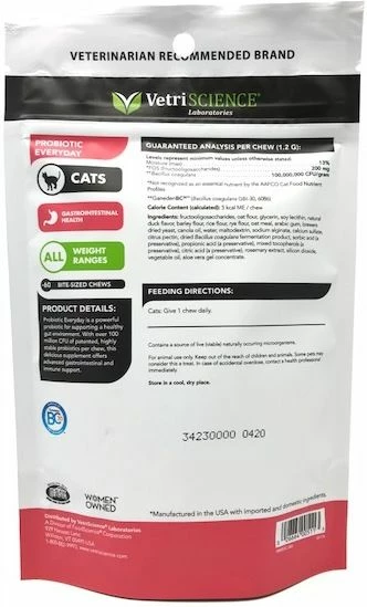 With over 100 million CFU of patented, highly stable probiotics per chew, this delicious supplement offers advanced gastrointestinal and immune support for your cat.