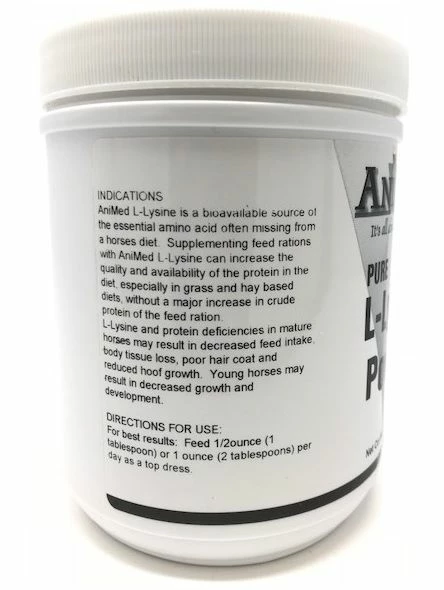 Feeding your horse Pure L-Lysine Powder may help increase the quality and availability of protein in the diet, especially in grass and hay-based diets, without a major increase in crude protein of the feed ration.