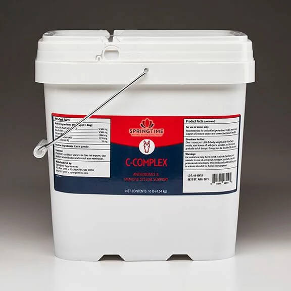 Horses: Enclosed scoop measures about 3/4 oz dry weight of Springtime C-Complex. For best results, start horses off with just a sprinkle for the first few days and increase gradually to at least one full scoop per day per 1,000 lb horse. Dose may be doubled or tripled during times of stress or for bleeders. (Dog scoop may also be used for horses – six scoops equals minimum serving per 1,000 lb horse.)