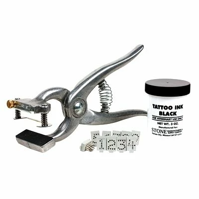 Outfit includes plier, set of 3/8″ digits 0-9 and 3 ounce jar of black ink.