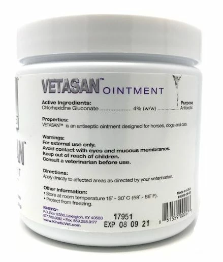 Vetasan Ointment is a topical antimicrobial ointment which is formulated for use on cats, dogs and horses. It contains the Active ingredient, chlorhexidine gluconate 4%. To be used to treat topical surface wounds.