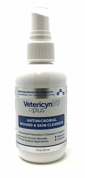 Vetericyn VF Plus Wound & Skin Cleanser is an advanced topical solution for the cleaning, irrigating, and debrinding wounds in animals.