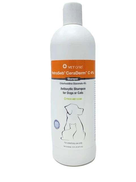 VetraSeb Ceraderm C 4% Shampoo contains chlorhexadine which is an antifungal and antibacterial ingredient. Also contains skin nourishing nutrients to moisturize and clam the skin.