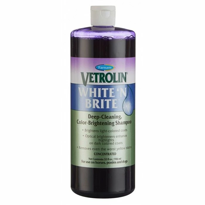 Contains coconut oil derivatives and optical brighteners that bring out the brilliance in white and light-colored coats. Works with either hot or cold water to remove the worst stains. Leaves mane, tail and coat with a healthy glow.