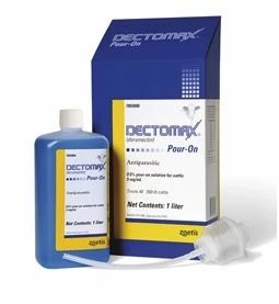 Dectomax Pour-On solution for cattle is used for the control of internal parasites such as gastrointestinal roundworms, lungworms and eyeworms. Also works to control external parasites such as grubs, biting and sucking lice, horn flies, and mange mites.
